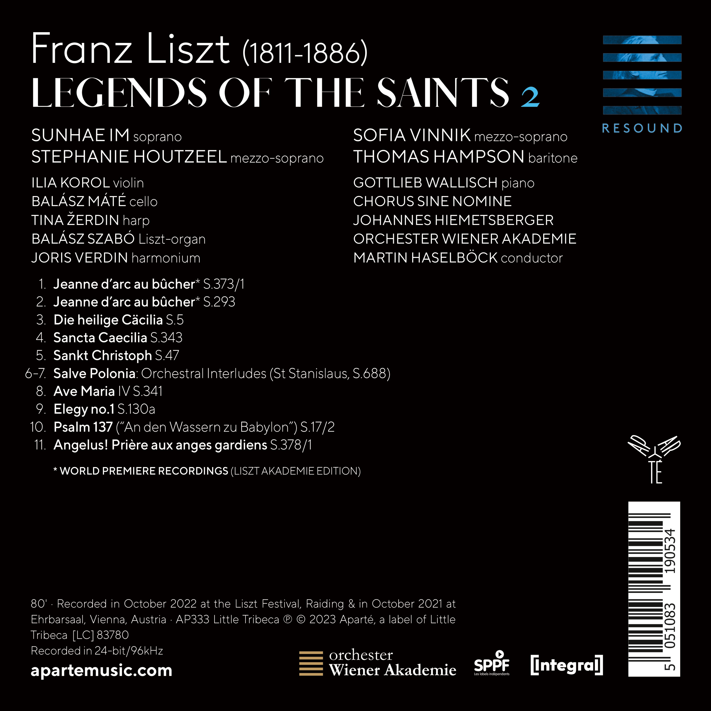 In this second volume of "Legends of the Saints", the Orchester Wiener Akademie, under the direction of conductor and organist Martin Haselböck, continues its recording of Liszt's mystical works. During the frequent religious periods of his life, the composer turned his attention to the lives of great martyrs and saints, who provided him with an entire body of work. These works, including two previously unreleased recordings of Jeanne d'arc au bûcher, Die heilige Caecilia and the Salve Polonia from the oratorio St Stanislaus, are performed here by the Wiener Akademie and a magnificent vocal cast (Sunhae Im, Stephanie Houtzeel and Sofia Vinnik as well as Thomas Hampson), whose timbres blend with the organ, harmonium, piano and harp to reveal the inexhaustible genius of Liszt's work.