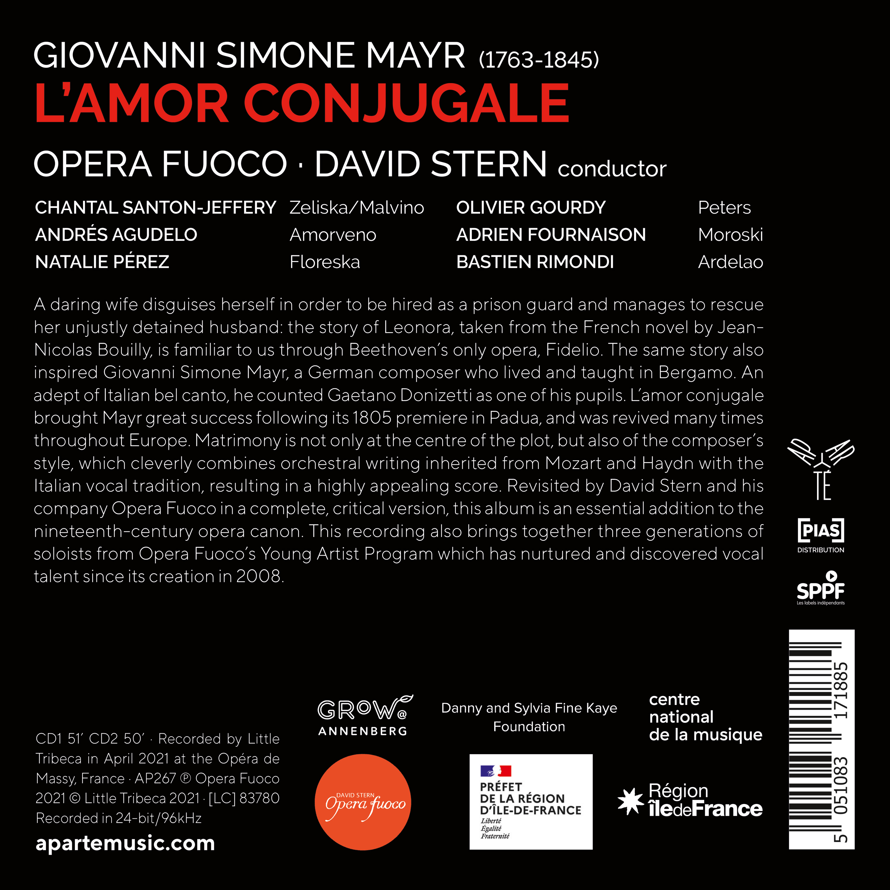 A daring wife disguises herself in order to be hired as a prison guard and manages to rescue her unjustly detained husband: the story of Leonora, taken from the French novel by Jean- Nicolas Bouilly, is familiar to us through Beethoven’s only opera, Fidelio. The same story also inspired Giovanni Simone Mayr, a German composer who lived and taught in Bergamo. An adept of Italian bel canto, he counted Gaetano Donizetti as one of his pupils. L’amor conjugale brought Mayr great success following its 1805 premiere in Padua, and was revived many times throughout Europe. Matrimony is not only at the centre of the plot, but also of the composer’s style, which cleverly combines orchestral writing inherited from Mozart and Haydn with the Italian vocal tradition, resulting in a highly appealing score. Revisited by David Stern and his company Opera Fuoco in a complete, critical version, this album is an essential addition to the nineteenth-century opera canon. The recording brings together three generations of soloists from Opera Fuoco’s Young Artist Program which has nurtured and revealed vocal talent since its creation in 2008.