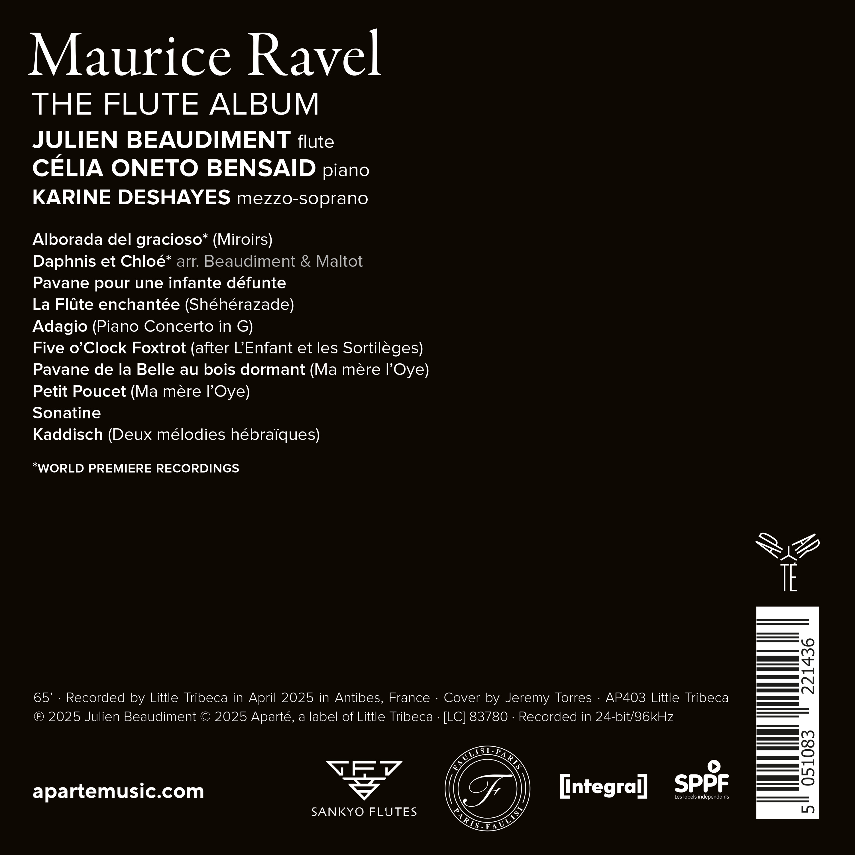 Daphnis et Chloé, the challenging Alborada del gracioso, La flûte enchantée or the Sonatine are thus adorned with the combined timbres of flute and piano – so much so that one might be tempted to think these transcriptions could just as well have been the original versions... A beautiful confirmation that, for Ravel, the flute truly is “the happy instrument of light and dream.”
