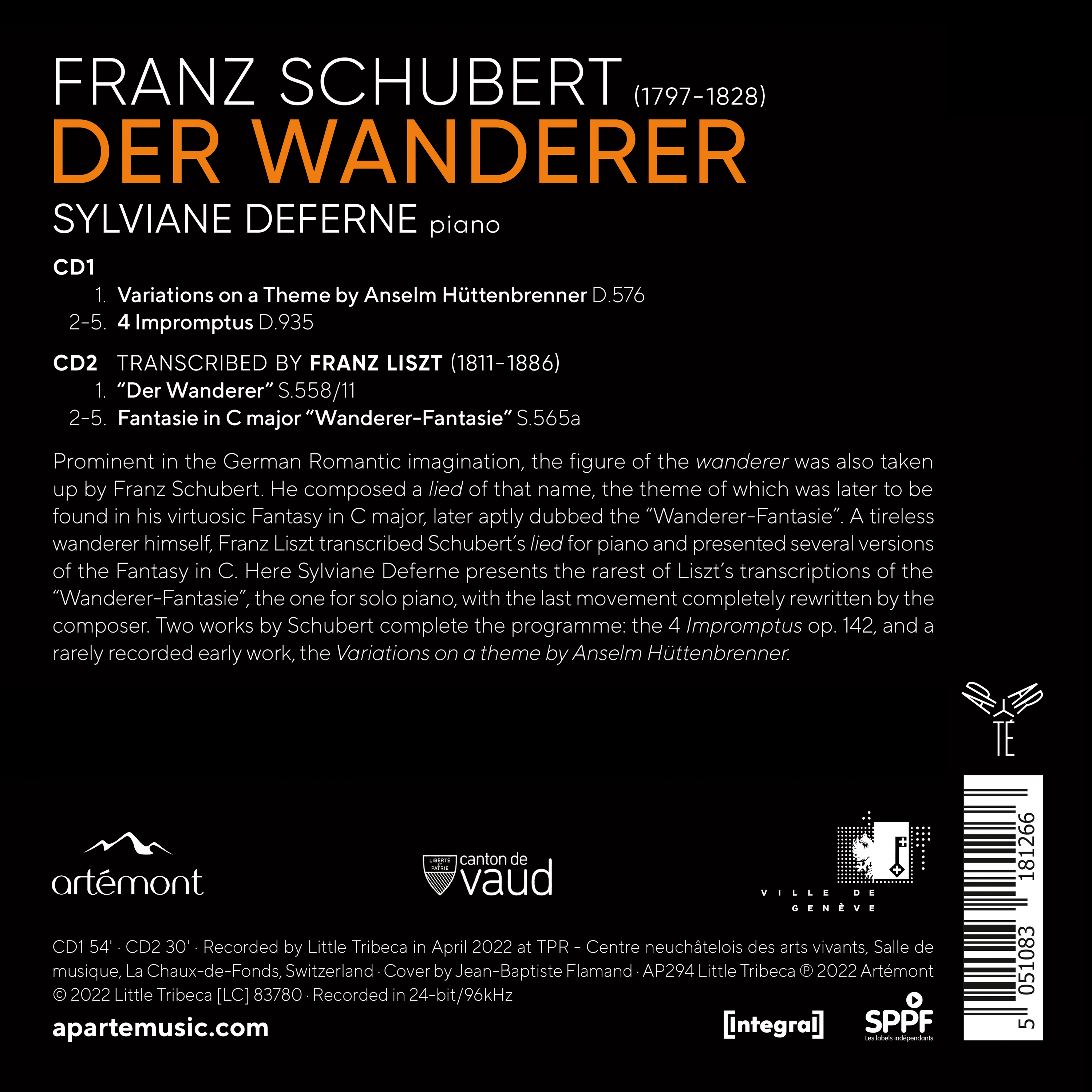Here Sylviane Deferne presents the rarest of Liszt’s transcriptions of the “Wanderer-Fantasie”, the one for solo piano, with the last movement completely rewritten by the composer. Two works by Schubert complete the programme: the 4 Impromptus op. 142, written a year before his death, and a rarely recorded early work, the Variations on a theme by Anselm Hüttenbrenner.