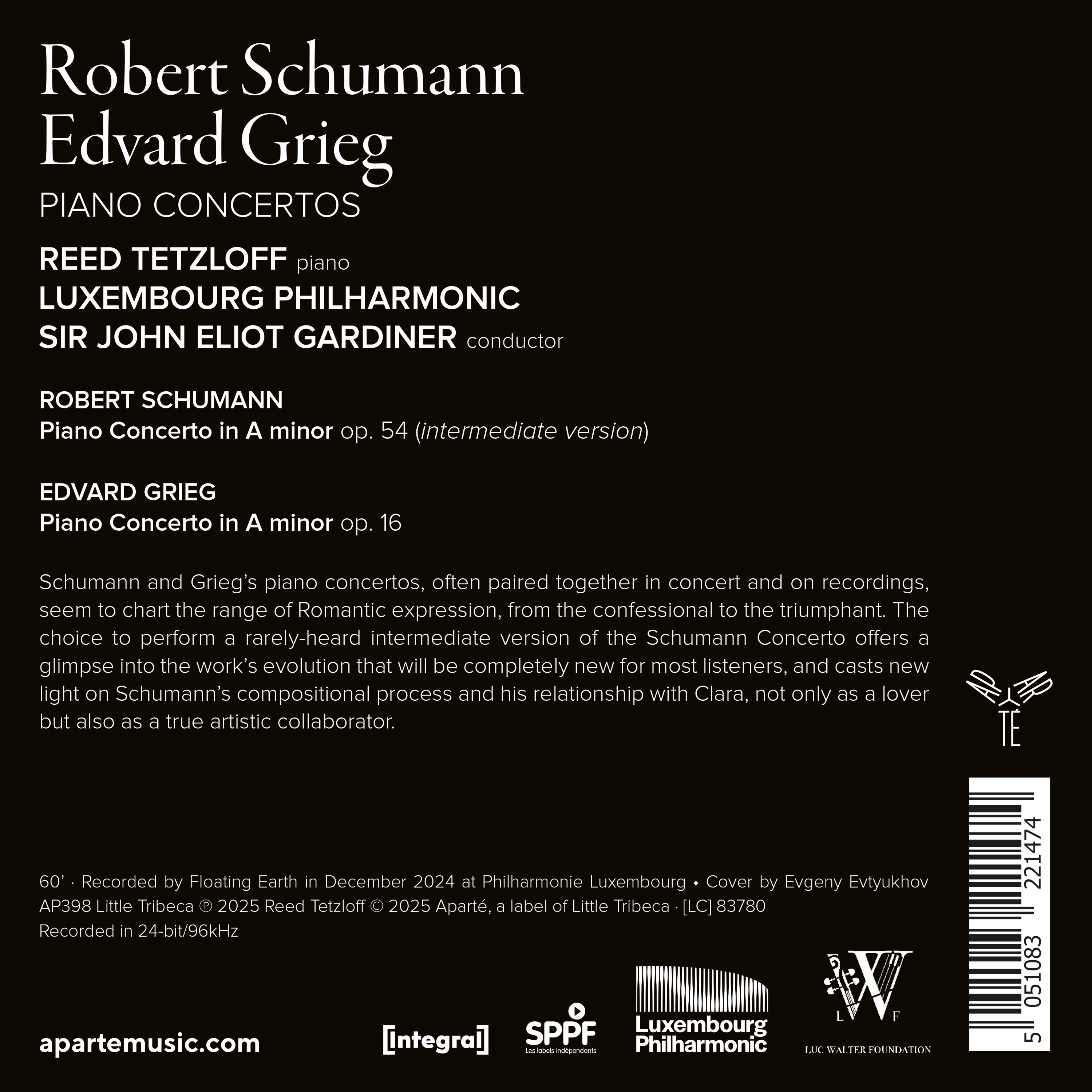 This album brings together Reed Tetzloff and Sir John Eliot Gardiner for the Schumann and Grieg concertos, featuring a rare version of Schumann’s concerto that highlights his creative bond with Clara, delivered in a lively, intimate, and surprising performance.