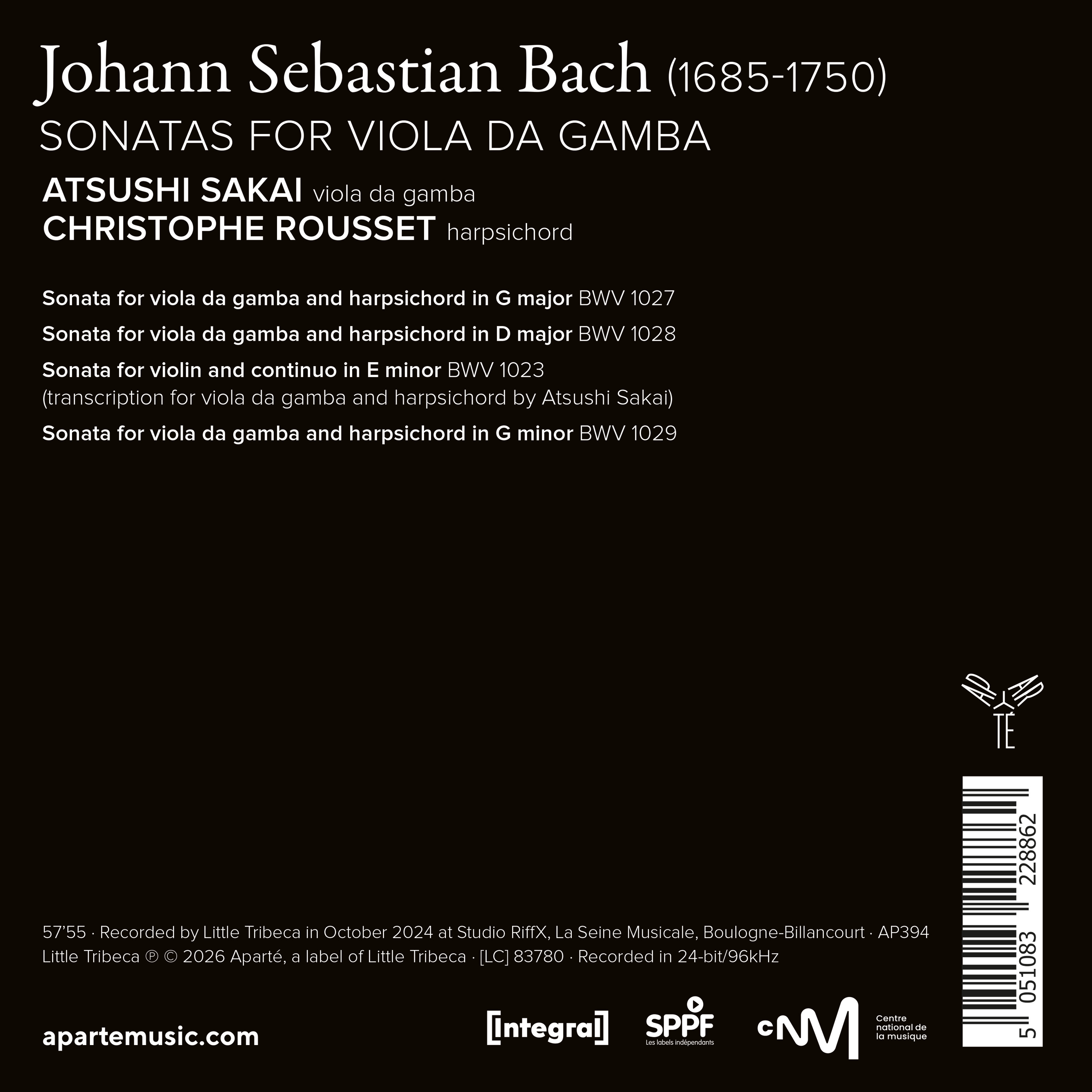 On sait peu de choses des sonates pour viole de gambe et clavecin de Johann Sebastian Bach. Sont-elles des œuvres de jeunesse ou de sa dernière période, constituent-elles un cycle ou bien un assemblage de compositions autonomes ? Atsushi Sakai et Christophe Rousset, partenaires en musique depuis de nombreuses années, s’attachent à graver ces pièces mystérieuses dans lesquelles la viole, comme souvent chez Bach, se fait tout à la fois la voix de la lamentation et l’outil de dialogue avec le divin.