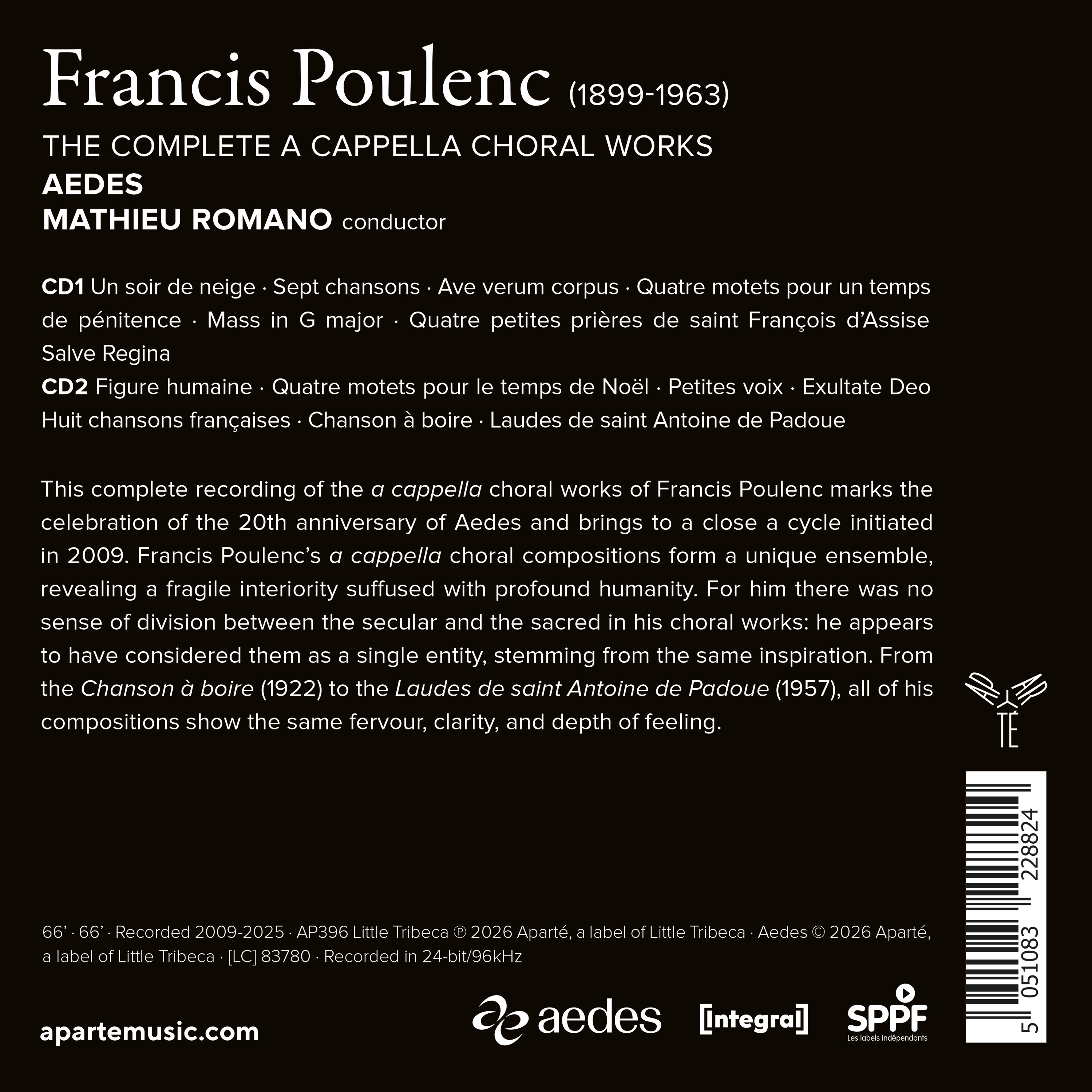 Cet enregistrement intégral des œuvres chorales a cappella de Francis Poulenc célèbre les vingt ans de l’ensemble Aedes et vient clore un cycle entamé en 2009. Les compositions chorales a cappella de Poulenc forment un corpus unique, qui révèle une intériorité fragile et empreinte d’une profonde humanité. Pour le compositeur, il n’existait pas de frontière entre le profane et le sacré : Poulenc semblait les envisager comme un tout, nourri d’une même inspiration. De la Chanson à boire (1922) aux Laudes de saint Antoine de Padoue (1957), ses œuvres témoignent toutes de la même ferveur, de la même limpidité et de la même intensité d’expression.